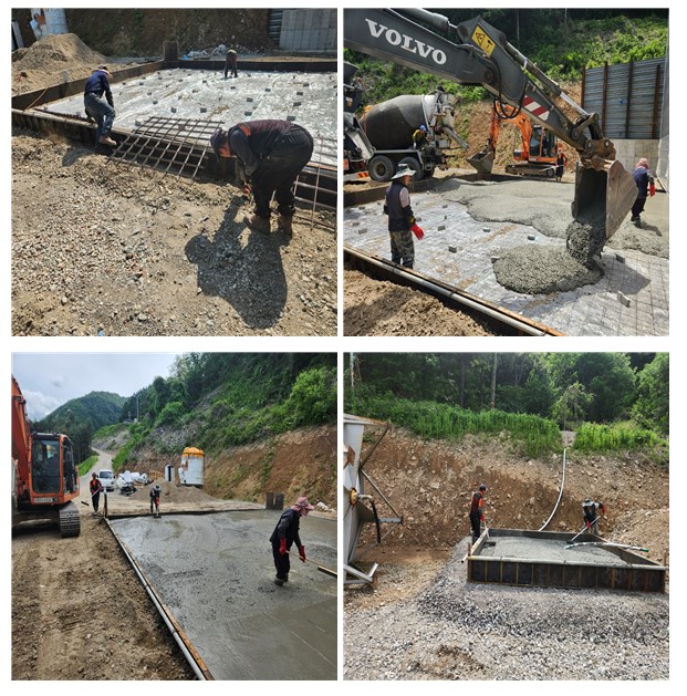 Concrete pads of 3m × 3m × 0.3m and 2m × 2m × 0.2m were also installed beneath the water tank and pump station areas to ensure structural stability.
