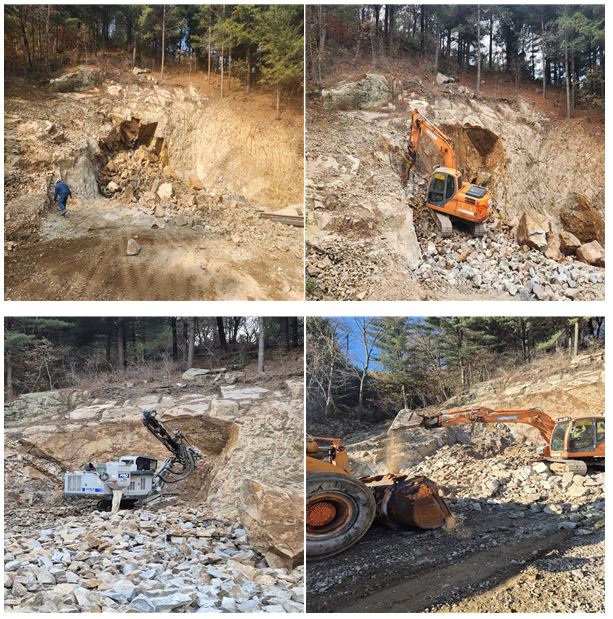 The front attachment of the excavator was replaced with a breaker to crush large rock blocks into smaller pieces, which were then classified as ore or aggregate. The classified ore and aggregates were transported and stockpiled at their designated locations.